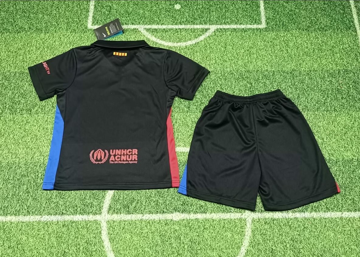 Get your Barcelona Away Kids Kit from 24/25 season. Add a name and number in the box for no added fee. Cheapest Price and best quality you can get. Ships world wide. 7-18 days shipping world wide. Size is in CM